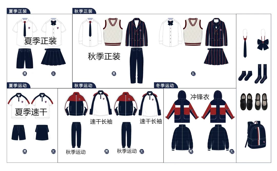 ④ 着装要求:(1) 大型活动、周一升旗仪式时穿正装(夏季、秋季)校服套装。(2) 周二至周五穿常规校服(速干衣运动装)。体育课时穿运动鞋。(校服类别详见下图)