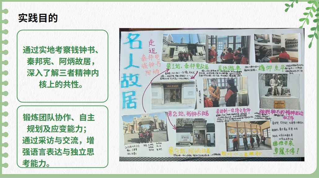 在老师们的指导下,同学们梳理故居建筑特色、挖掘名人轶事典故、结合自身文化体悟撰写了考察报告。在班级成果交流会上,各小组的表现更是精彩纷呈,手绘展板、江南风PPT、创意研学vlog……独具匠心的呈现展示了同学们对无锡历史文化的个性化理解,更彰显了当代青少年传承文化的新思维、新方法。