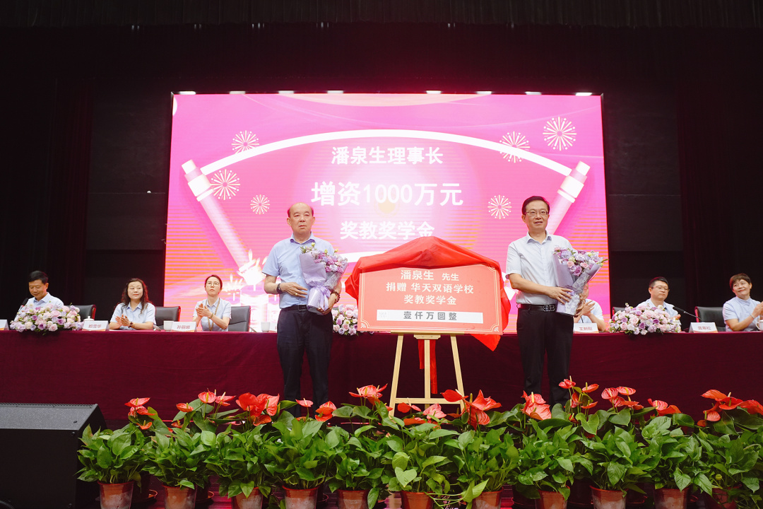 创校四年来,潘理事长已累计向学校捐赠2500万元,用于设立奖教奖学金,助力师生成长与发展。值此教师节来临之际,潘理事长再捐1000万元奖教奖学金,以激励广大教职员工及华天学子奋发向上、勇攀高峰。