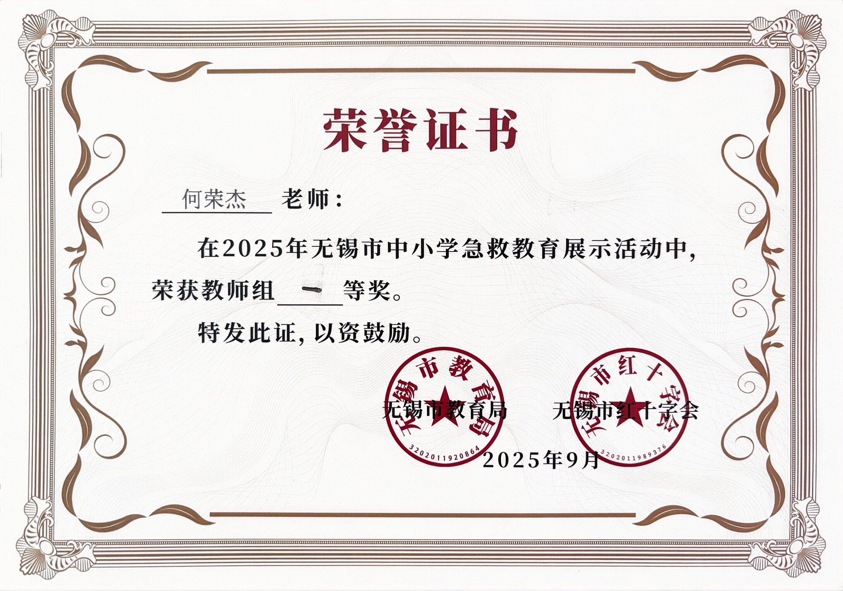 近日,在“人人学避险,人人懂急救”2025年无锡市中小学急救教育展示活动中,经过理论与实操的激烈角逐,我校初中部陶娜老师荣获教师组特等奖,小学部何荣杰老师荣获教师组一等奖!