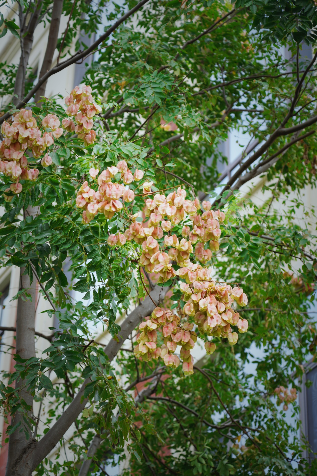 它们伫立在餐厅入口的两旁,一左一右。夏日里青翠的树冠,不知不觉间已被秋风染成了深浅不一的金黄。那一簇簇粉红色的蒴果,如小灯笼般挂满枝头,微风拂过,满树的生命力在轻轻摇晃。