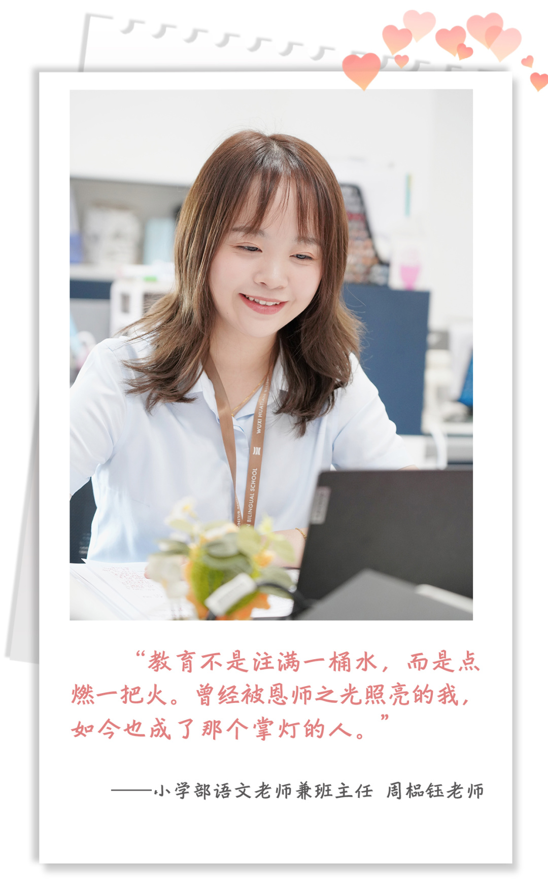 作为小学部语文老师兼班主任,周榀钰老师以温暖而坚定的姿态行走在教育之路中,把自己活成一道光,去点亮更多孩子的童年。