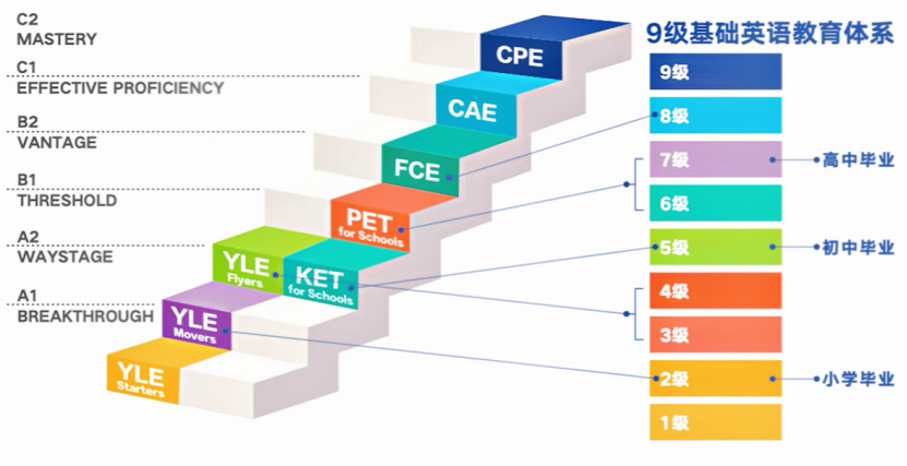 依据中国英语能力等级量表、欧洲语言共同参考框架(CEFR,即“欧标”) 与剑桥英语证书考试的官方对标关系: