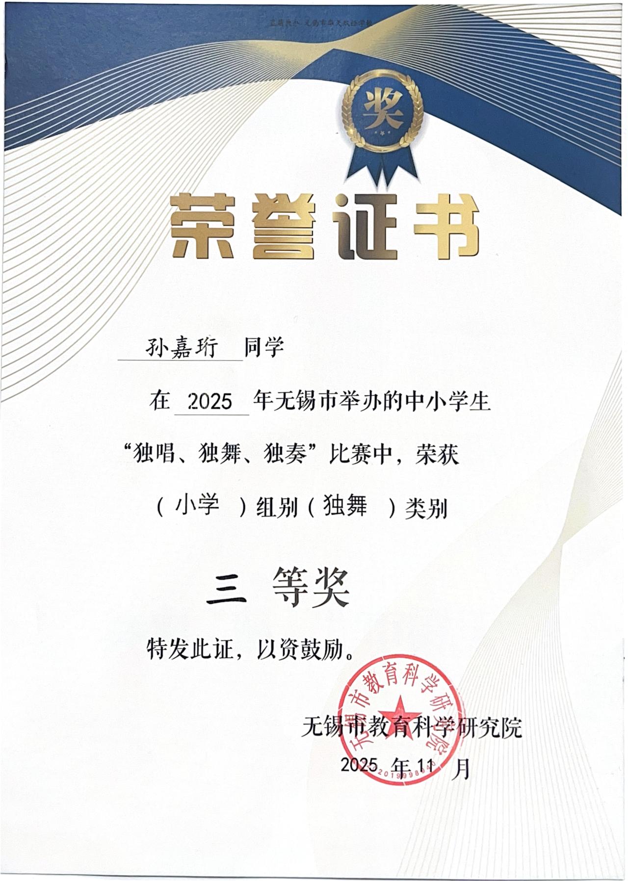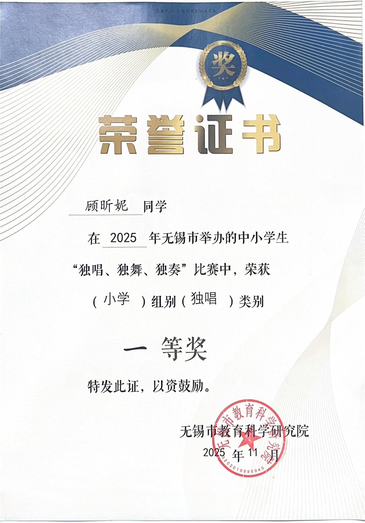 更为重要的是,通过大赛的平台,我们发现了许多在不同领域拥有突出潜质或兴趣特长的学生,其中有三位同学被选送参加2025年无锡市中小学生“独唱·独奏·独舞”比赛并取得了优异的成绩。