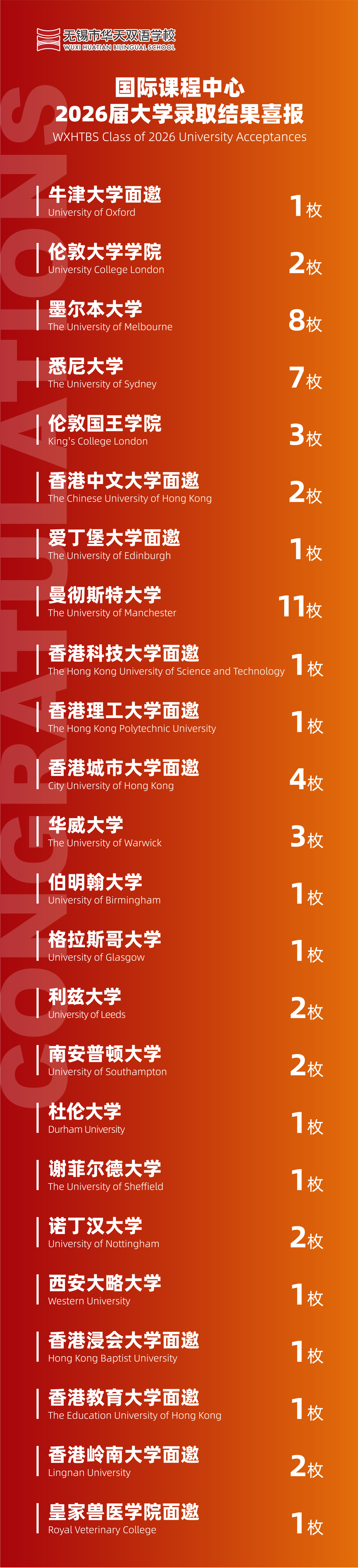 来华天,走更远,眼下正值2026申请季,国际课程中心毕业生已经收到来自多个国家与地区的众多大学录取及面邀。