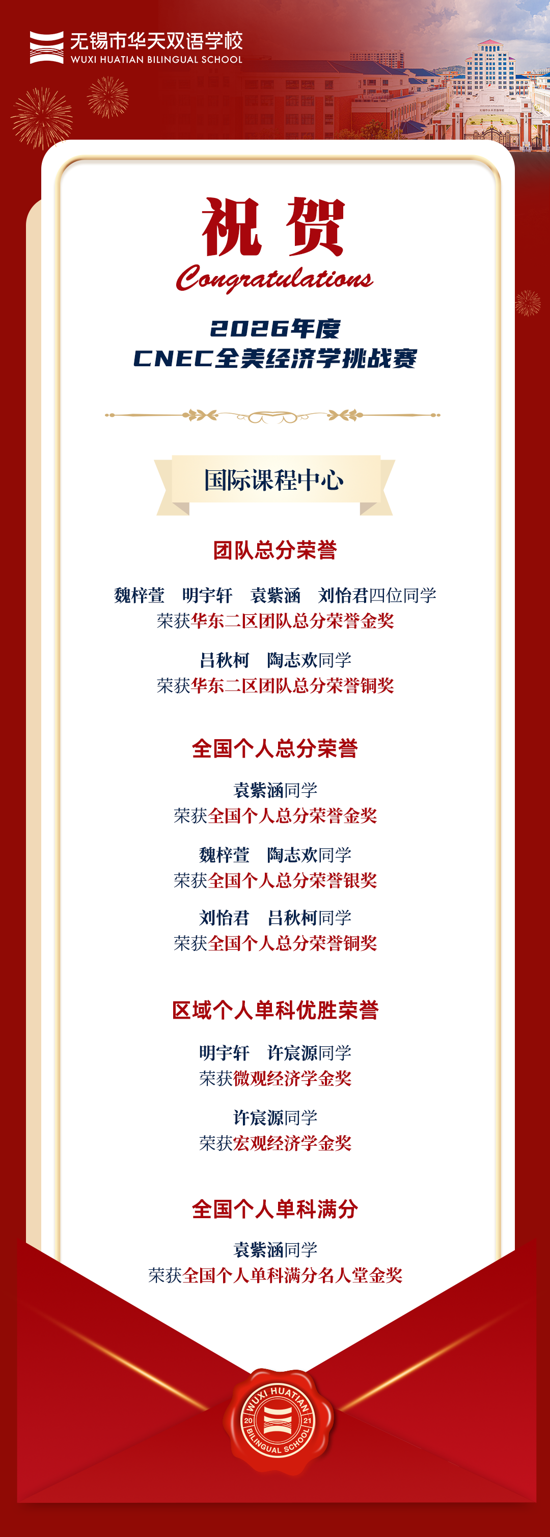 近日,2026年度CNEC竞赛初步结果揭晓,无锡市华天双语学校国际课程中心再创佳绩,展现了在经济学领域出色的教学成果。